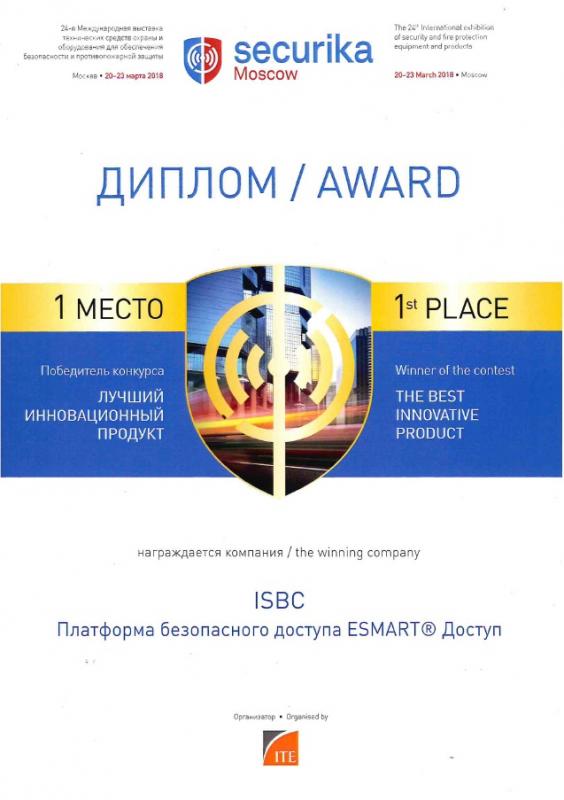 Российский бренд ESMART® занял 1 место в конкурсе «Лучший инновационный продукт», номинация СКУД, на выставке Securika Moscow 2018. Платформа безопасного доступа ESMART® Доступ обеспечивает интеграцию Систем контроля и управления доступом и сервисов Умного города. Продукт, разработанный и произведенный в России, г.Зеленоград, реализует концепцию единой защищенной среды.